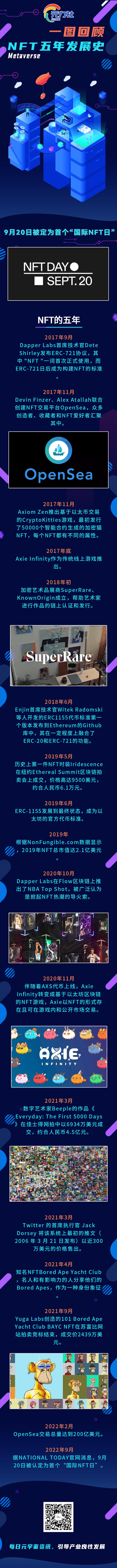 据NATIONAL TODAY官网消息,9月20日被定为“国际NFT日”。这一日期的选定是因2017年9月20日,区块链技术公司Dapper Labs首席技术官Dieter Shirley发表名为ERC-721协议的论文并首次提出“Non-Fungible Token(NFT)”。