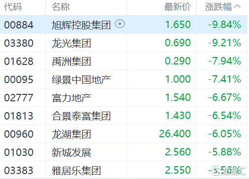 自8月中以来整体反弹的港股内房股今日明显回落,旭辉控股跌近9%,合景泰富跌超7%,富力地产、碧桂园跌超6%,龙湖集团跌超5%,禹洲集团、中骏集团、时代中国、雅居乐和新城发展跌超4%。