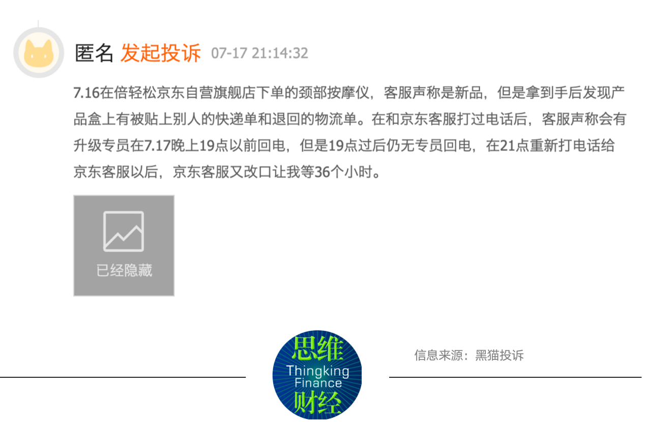 在黑猫投诉平台上,一位消费者在倍轻松京东自营旗舰店下单的颈部按摩仪,客服声称是新品,但是拿到手后发现产品盒上有被贴上别人的快递单和退回的物流单。