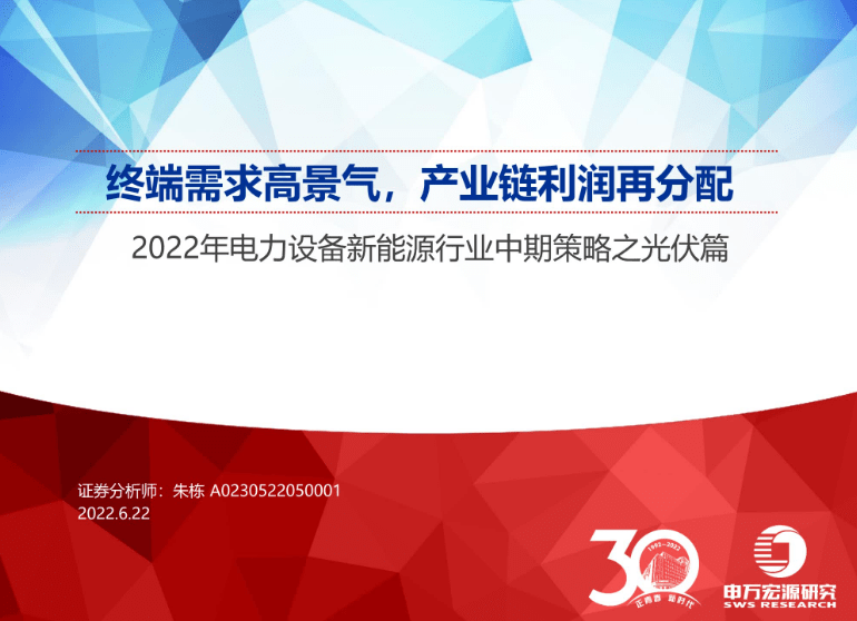 在碳中和的背景下,全球光伏装机有望保持较高增速,2022年全球新增光伏装机有望达到250GW,终端需求确定性高。目前中下游环节由于上游原材料价格持续上涨,利润受到一定挤压,22年Q4随着硅料产能释放,硅料价格有望下行,重点关注上游原材料价格下降后的产业链利润再分配。