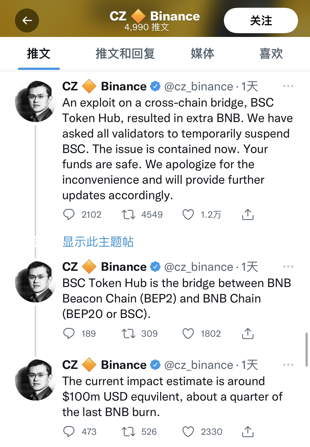 同日,赵长鹏发布推特称,在“跨链桥”上的漏洞导致了额外的BNB代币生成,公司已经请求全部验证者来暂停BNB智能链上的交易,并将提供进一步更新。