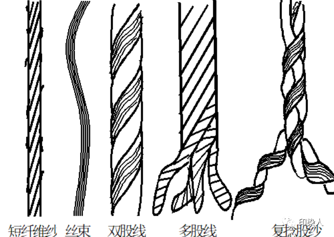 捻向分别称作S捻纱和Z捻纱;回丝、废丝、废纱、接头纱等;管纱、筒子纱、绞纱;原色纱、漂白纱、染色纱、烧毛纱、丝光纱等。
