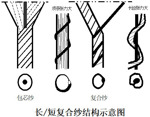以长丝为芯,短纤维为皮的包缠结构的纱,属复合纱