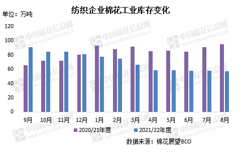 本月棉花企业积极销售,下游虽出现好转,但市场上棉花供应充足,需求仍然弱势,叠加新棉开秤在即,市场谨慎情绪增加。纺织企业多仍维持随用随买的策略,将原料库存维持在低位。截至8月31日,纺织企业在库棉花工业库存量为57.32万吨,较上月底减少0.49万吨,同比减少38.23万吨。其中:28%的企业减少棉花库存,25%增加库存,47%基本保持不变。